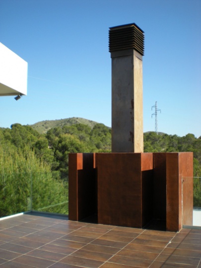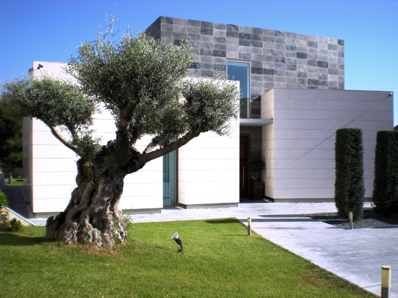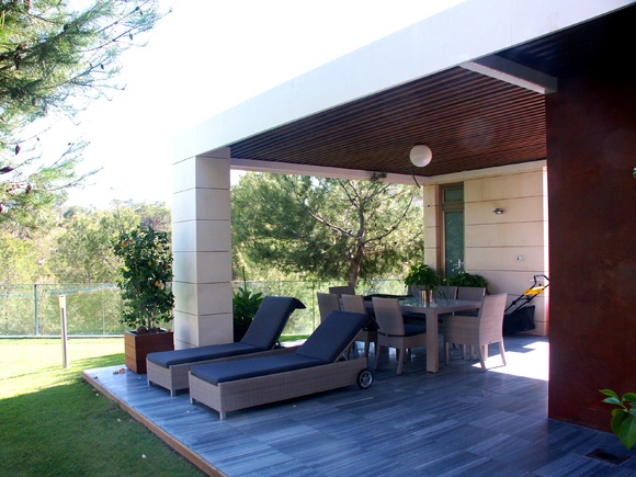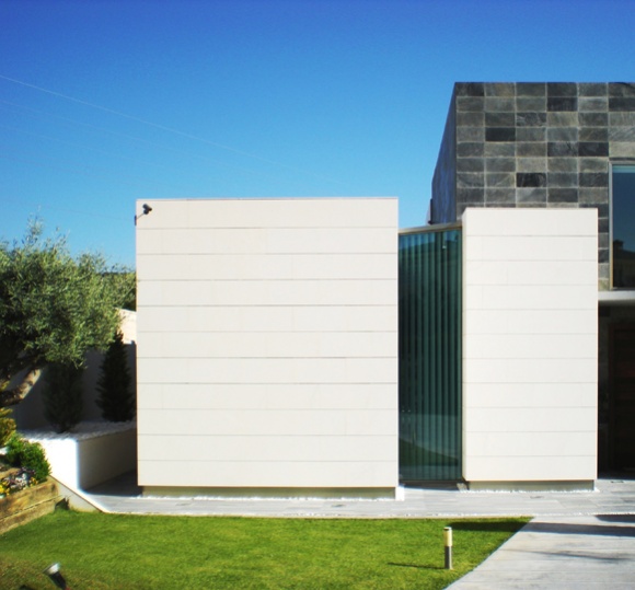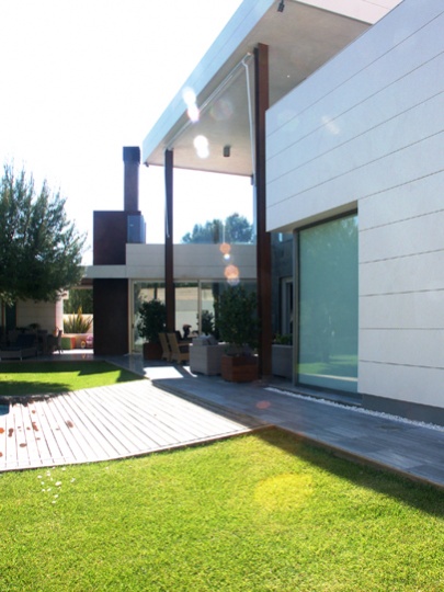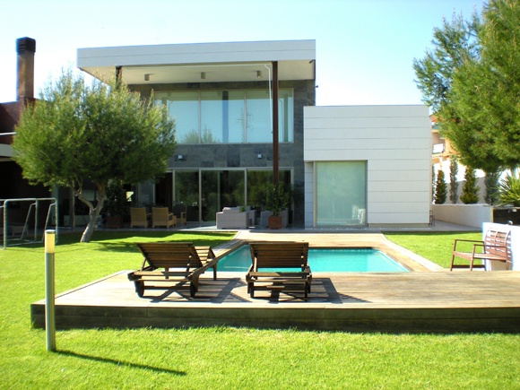 La vivienda, situada en una parcela trapezoidal que se estrecha en su frente de parcela, avanza hacia el mismo hasta una distancia tal que permite inscribir la superficie requerida por el cliente y a la vez desarrollar en la parte posterior de ésta la zona de esparcimiento con la urbanización, barbacoa y piscina.