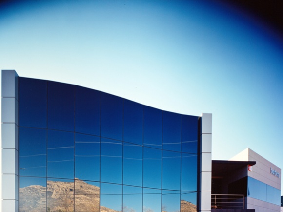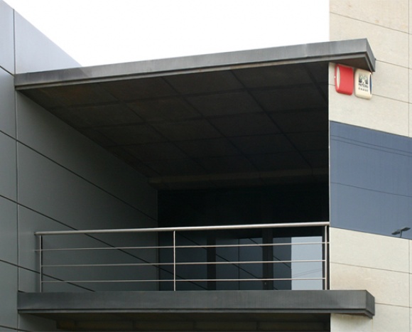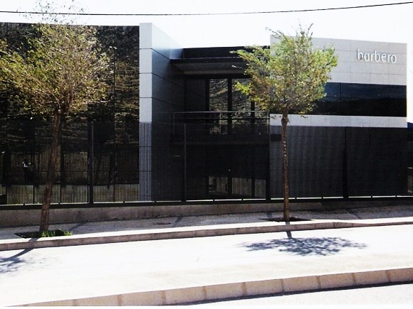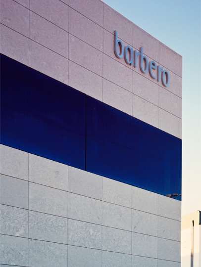El segundo, destinado a oficinas y showroom, se encuentra en el frente de fachada de la edificación, por delante de aquél. Construido con materiales nobles de gran calidad arquitectónica, configurado por tres volúmenes claramente diferenciados y ordenados según su eje principal, contiene los servicios administrativos y comerciales de esta importante empresa internacional, referencia en el sector del calzado.
