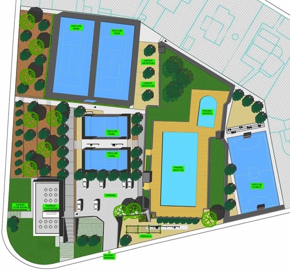 Complejo deportivo construido sobre una superficie de 11.000 m2. El complejo lo constituyen un pequeño edificio para club social y gimnasio, y el resto de instalaciones deportivas al aire libre. Dará servicio a una futura urbanización de 400 viviendas unifamiliares.